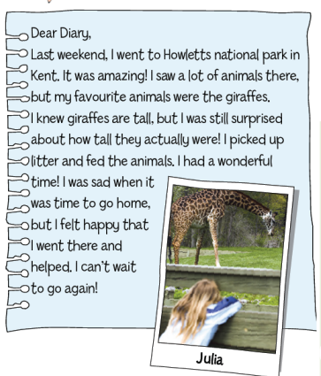 Imagine you went on a volunteering holiday to a national park. Write a diary entry about your experiences there (about 60-80 words). Include the name and the location of the park, what you saw/ did and your feelings. |