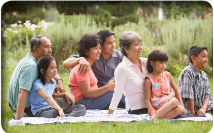 This is a picture of my family. My family consists of seven people: grandparents, parents, and three of us. My grandparents are both dressed in black slacks with a blue t-shirt on him and a white t-shirt on grandmother. My father is dressed in a navy t-shirt, while my mother is dressed in a pink shirt and blue jeans. I was dressed in a checkered shirt, while my two sisters were dressed in flowery skirts and blue short-sleeved shirts with gray leggings.