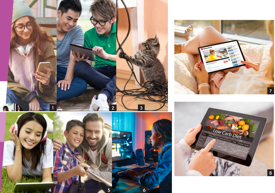 1. In pairs, ask and answer the questions. 2. Listen and repeat. What objects can you see in the picture (1-8)? 3. Read the text. Choose the correct option. Listen and check. 4. Listen to people talking about their phones and tick (✓) the expressions you hear. What activities do you see in the pictures (1-8)? 5. In pairs, ask and answer the questions.