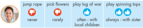 I like to play jump rope and tug of war because I can play them with everyone. I don't like picking flowers because I think it's boring.