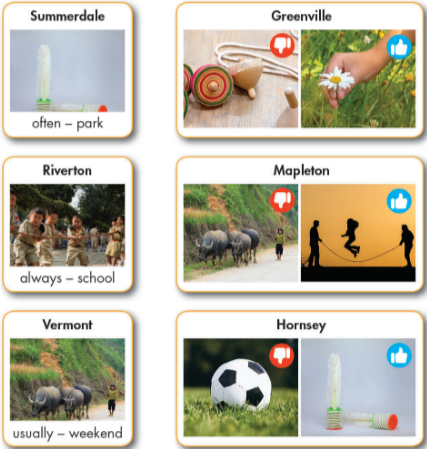 Let's Talk! In pairs: Look at the picture. What are the children doing? What else can children do for fun in the country? New Words a. Read the sentences, then match the words with the definitions. Listen and repeat. b. In pairs: Talk about what you like to do when you visit places in the country. Reading a. Read Vy's blog post. What does she mostly talk about? b. Now, read and circle the correct answers.
