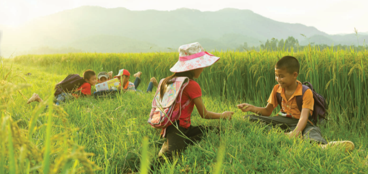 (Trong ảnh, trẻ em đang chơi trên cánh đồng. Trẻ em vùng quê có thể chơi một số trò chơi như thả diều, nhảy dây, bắn bi...)