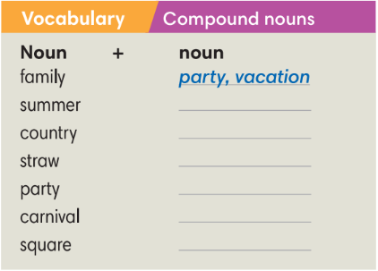 1. What’s your favorite festival? 2. Listen to the first part of an interview with Santiago. Where does he live? 3. Listen to the second part of the interview. Answer the question below. 4. Listen again. Choose the correct answers. 5. In groups, complete the compound nouns in the Vocabulary box with the words below. Compare your ideas with the class. Listen and check.