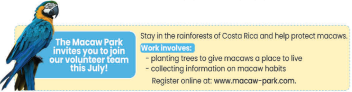 Ở lại trong rừng nhiệt đới Costa Rica và giúp bảo vệ vẹt đuôi dài. Công việc gồm: - trồng cây để tạo môi trường sống cho vẹt đuôi dài - thu thập thông tin về môi trường sống của vẹt đuôi dài Đăng ký tại: www.macaw-park.com. |