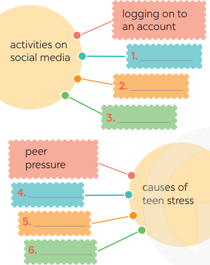 Mike has a busy and active life. He does well at school and (1) _____ in many (2) _____ like basketball and chess clubs. He is also a member of the school community projects, where he (3) _____ with other teens and learns new (4) _____. He has many classes, but he can still manage his schoolwork well. Mike is also an active member of his class forum. He and his friends (5) _____ pictures and videos about their class activities. They also discuss homework, their problems and how to deal with pressure from parents, friends, and schoolwork. The most common problem they discuss is how to deal with (6) ______.