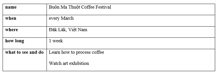 Hôm nay tớ sẽ giới thiệu với các bạn một trong những sự kiện văn hóa lớn nhất ở Việt Nam. Đó là Lễ hội cà phê Buôn Ma Thuột. Nó diễn ra vào tháng 3 hàng năm tại Đăk Lăk, Việt Nam. Sự kiện này kéo dài một tuần. Mọi người đến đây để học cách chế biến cà phê, xem triển lãm nghệ thuật. Đôi khi bạn sẽ có cơ hội tham gia pha chế cà phê. Đây là ngày hội nhằm truyền bá văn hóa cà phê tới mọi người.