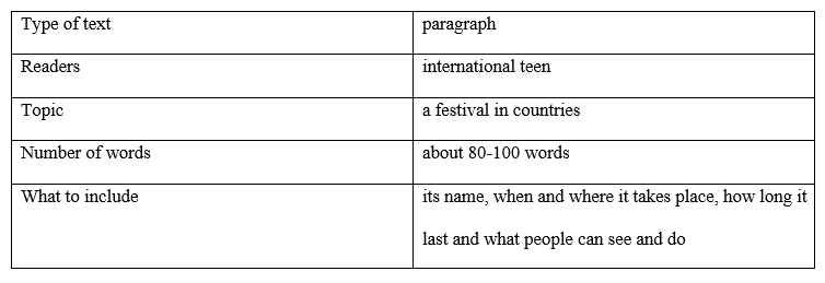 (Thu thập thông tin về một lễ hội ở đất nước em. Sử dụng ghi chú của em để viết một đoạn văn về nó (khoảng 80-100 từ).)