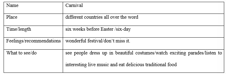 8 Collect information about a festival in your country under the headings name, when and where, how long and what to see and do. Present the festival to the class.