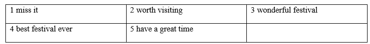 4 Collect information about the cultural event in the text under the headings name, when and where, how long and what to see and do. Present the event to the class.