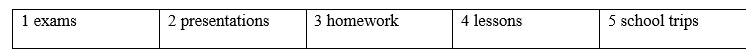 (Điền vào chỗ trống với các từ lessons, homework, exams, school trips hoặc presentations.)