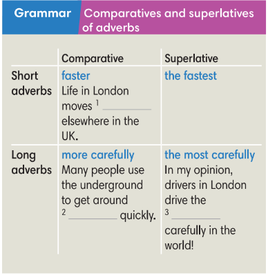 1. Look at the photos of London. What do you know about these places? 2. Read the text and complete the examples below. 3. Change these comparative adjectives into comparative adverbs then superlative adverbs. 4. Rewrite the second sentences so that they have the same meaning as the first sentences. Some words have been given to help you. 5. Work in groups. Compare city life and country life. Use the following verbs: work, drive, play, move, talk, and study.