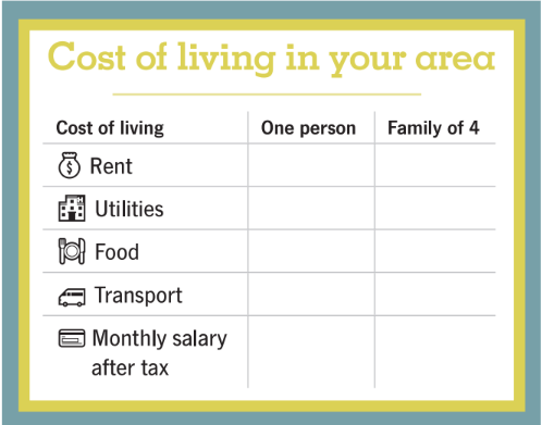 1. Look at the table below. Complete the table with the amount of money you estimate it costs to live in your area. Compare it with your friends.