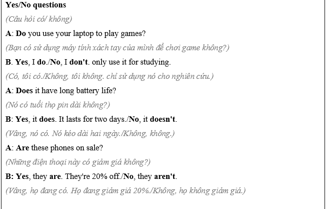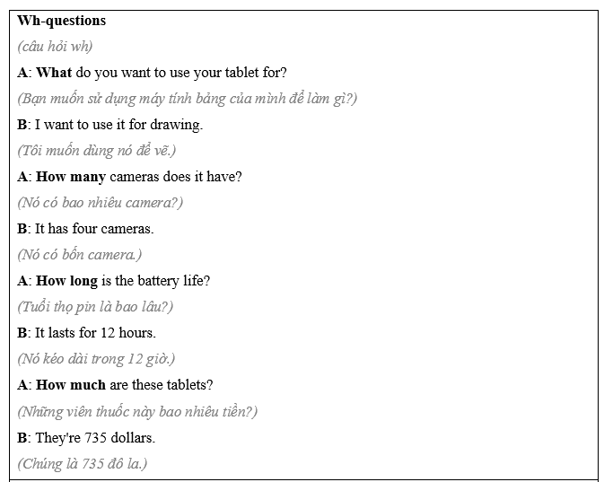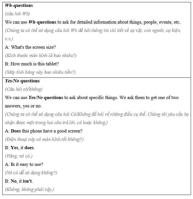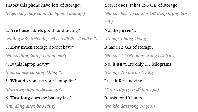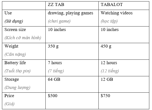 (Bạn đang mua một chiếc máy tính xách tay hoặc máy tính bảng mới. Làm việc theo cặp: học sinh A, bạn muốn mua một chiếc máy tính bảng. Nói chuyện với trợ lý bán hàng và hỏi về những điểm dưới đây. Học sinh B, trang 114, Tệp 1.)