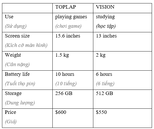 (Trao đổi vai trò và lặp lại. Học sinh A giúp học sinh B chọn máy tính xách tay.)