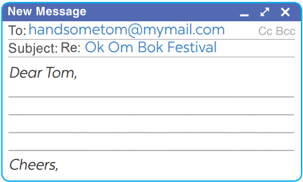 Write an email (80 - 100 words) to advise Tom about participating in the Ok Om Bok Festival.