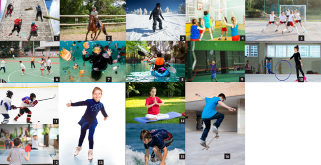 (Thể thao ngoài trời: leo núi, cưỡi ngựa, bóng rổ, bóng chuyền, yoga, trượt ván, bóng ném, trượt tuyết, chèo thuyền kayak)