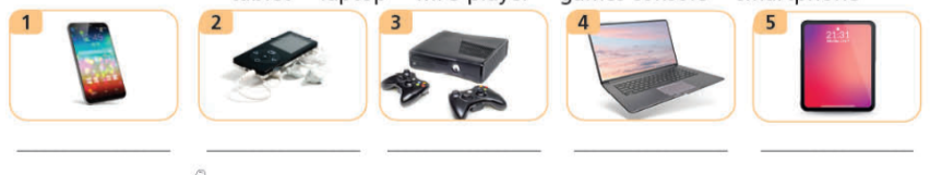 1 Label the pictures with the words from the list. 2 Match the words (1-5) with (a-e) to make phrases. 3 Listen to two teenagers talking about their electronic devices. For questions (1-5), choose the correct options (A, B, C or D). 4 Which of the devices in Exercise 1 have you got? What do you use it/them for?