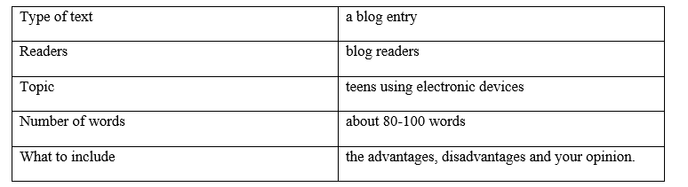 Write a blog entry about teens using electronic devices (about 80-100 words). Include advantages, disadvantages and your opinion.