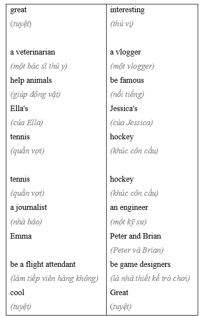 (Điều đó nghe thật tuyệt! Còn giấc mơ của Ella thì sao? Tôi đoán rằng cô ấy sẽ trở thành một cầu thủ quần vợt. Tôi có đúng không?)