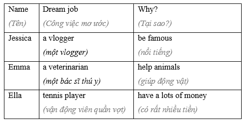 (Bạn đang thực hiện một cuộc khảo sát về những gì thanh thiếu niên muốn làm trong tương lai. Điền vào bản khảo sát cho chính mình. Trong nhóm bốn người: Hỏi ba người bạn ước mơ của họ là gì và tại sao. Sau đó, hoàn thành bảng.)
