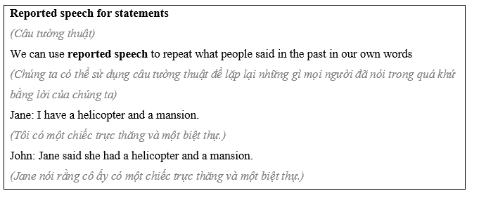 (Sử dụng những ý tưởng của riêng bạn để tạo ra những câu tương tự về bản thân và nói với bạn của bạn. Sau đó, báo cáo câu tường thuật của bạn cho một bạn khác.)