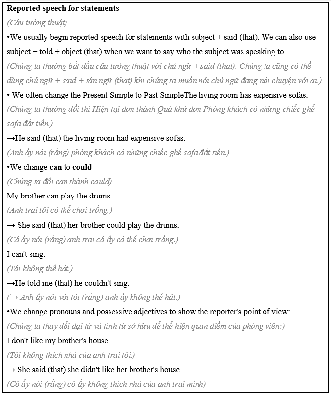 me that he had two parrots. (Anh ấy nói với tôi rằng anh ấy có một con chó lớn và nó ngủ trong phòng anh ấy. Anh ấy cũng nói với tôi rằng anh ấy có hai con vẹt.))