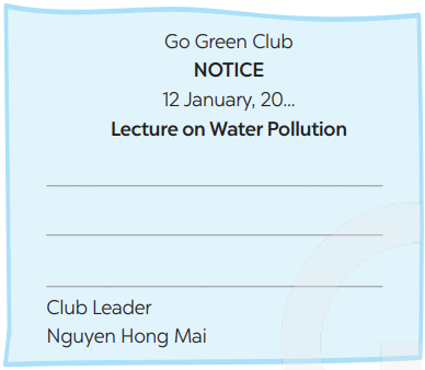 5. Write a notice for the Go Green Club leader to invite students to attend a lecture on water pollution. Use the following details.