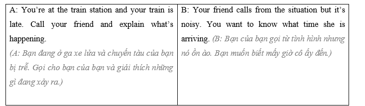 A: Hi, it’s me. I’m at the train station and my train is late. (Xin chào, tôi đây. Tôi đang ở ga xe lửa và chuyến tàu của tôi bị trễ.)