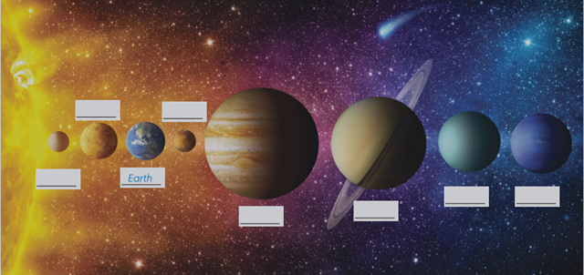 We live on (1) _______, but this is just one planet in our solar system. The planets can be put into two groups. The four planets which are closest to the Sun are called the inner planets. These include (2) _______, Venus, Earth, and (3) _______. These planets are made of rock and are smaller than the other planets. The other planets are farther from the Sun so we call them the outer planets. The biggest outer planet is (4) _______, (5) _______ is also an outer planet which is known for its rings. Two other outer planets are (6) _______ and Uranus. Outer planets are made of gas.