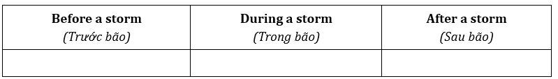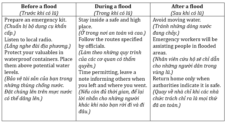 (Làm việc theo cặp. Thảo luận về những gì bạn nên làm trước, trong và sau lũ lụt. Viết ý tưởng của bạn trong các cột.)