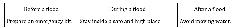5. Write instructions (80 - 100 words) about things to do before, during, and after a flood.