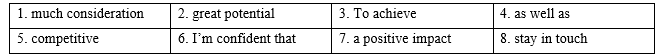 much consideration – great potential – To achieve – as well as – competitive – I’m confident that – a positive impact – stay in touch |