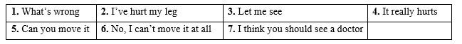 It really hurts (Nó thực sự rất đau) I think you should see a doctor (Tôi nghĩ bạn nên gặp bác sĩ) I’ve hurt my leg (Tôi bị thương ở chân) Can you move it (Bạn có thể di chuyển nó được không) What’s wrong (Chuyện gì vậy) No, I can’t move it at all (Không, tôi không thể di chuyển nó được) Let me see (Để tôi xem nào) |