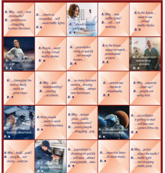 Play “Connect four.” You are writing an article about changes to a city. Complete the table with your ideas. Highlight one piece of information for each problem.Now, write an article about changes to the city. Write 100 to 120 words.