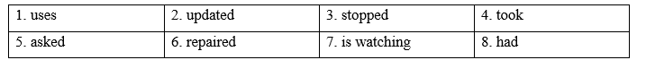 Lily usually (1) _______ (use) her smartphone for communication and entertainment. Yesterday, she (2) _______ (update) her social media app on her smartphone when it (3) _______ (stop) working. Then, she (4) _______ (take) it to the electronics shop and (5) _______ (ask) them for help. They (6) _______ (repair) it all yesterday afternoon. At the moment, Lily (7) _______ (watch) videos online on her smartphone. In fact, she wishes she (8) _______ (have) a new smartphone, but her parents asked her to wait until her birthday. |