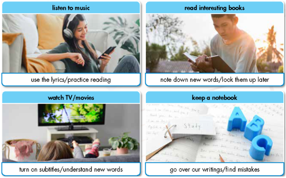 Let’s Talk! In pairs: Look at the pictures. What are these people doing to improve their English? What do you do to improve your English in your free time? a. Read the sentences, then match the words to the definitions. Listen and repeat. b. In pairs: Use the new words to talk about what you like to read, watch, or listen to in English. a. Read the online article about English study methods. What is the passage mainly about? b. Now, read and fill in the blanks. c. Listen and read. d. In pairs: W