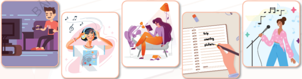 A: Let’s talk about some fun ways to learn English. What activity can we do?