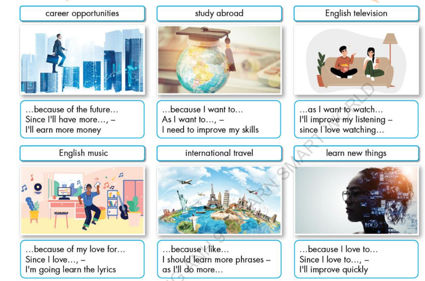 B: I'm learning English because of future career opportunities. Since I'll have more career opportunities, I'll earn more money.