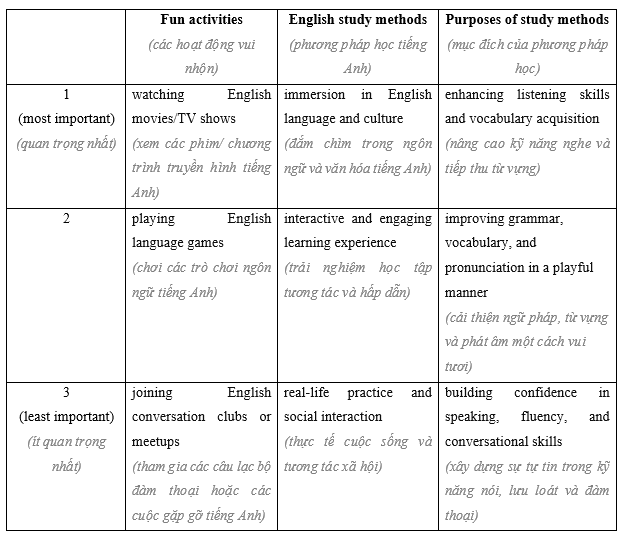 (Mỗi hoạt động đều có sức hấp dẫn riêng, nhưng nếu tôi phải chọn một hoạt động làm thú vị nhất, có lẽ đó là xem phim hoặc chương trình truyền hình bằng tiếng Anh. Điều này bởi vì nó kết hợp giải trí với việc học một cách động lực và sâu sắc, mang lại cả niềm vui và giá trị giáo dục đồng thời.)