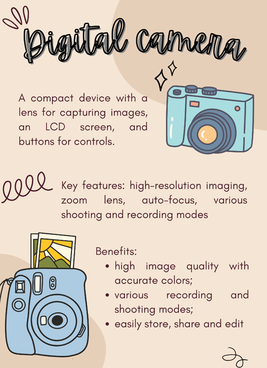 - Its appearance, main parts, key features: A digital camera is a compact device with a lens for capturing images, an LCD screen, and buttons for controls. Key features include high-resolution imaging, zoom lens, auto-focus, various shooting modes, video recording, and connectivity options.