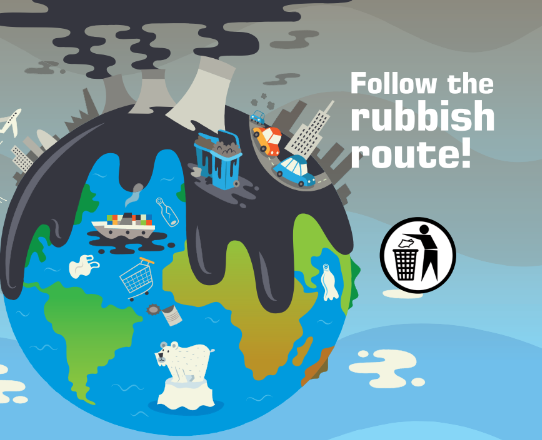 Where does the rubbish route start? Well, probably in factories that produce food and drinks in plastic bottles, packets and aluminium cans. Every day, huge trucks deliver these goods to shops for us all to buy. Imagine a group of friends living in a big city, where cars and trucks pollute the environment. They decide to escape the traffic and polluted air and spend a day outside the city where there are lots of parks and open spaces. They take a picnic bag with cans of soft drinks, packets of crisps and cookies and fruit in plastic bags. They enjoy their picnic, but they might leave their rubbish on the ground because the rubbish bins are full - perhaps the wind picks it up and so it ends up in the river! What happens then?
