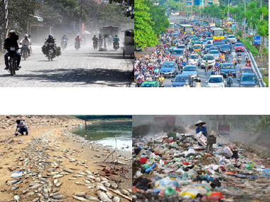 The first photo is of air pollution with a lot of dust around the environment. The second picture is a traffic jam, which will also easily cause noise pollution and air pollution due to car horns and exhaust fumes from vehicles. The third photo is water pollution and we can see that there are many dead fish on the shore. And in the last photo there is a lot of trash, this is the problem of littering and littering in the wrong place.