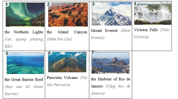 (Thu thập thông tin về một kỳ quan thiên nhiên ở nước bạn dưới tiêu đề tên, địa điểm và mô tả. Trình bày thông tin trước lớp.)
