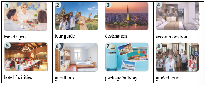 Hello, readers! Today, I want to tell you about my last summer holiday. My friends and I weren’t sure about the place, so we spoke to a(n) (1) _______. She helped us choose our holiday (2) _______ in Việt Nam and helped us book a(n) (3) _______ with everything included. We weren’t sure whether we were going to stay at a hotel or at a(n) (4) _______, but finally she booked (5) _______ for us at a beautiful hotel with great (6) _______ like a restaurant and a gym. She also arranged for us to go on a(n) (7) _______ around the city with a(n) (8) _______ to tell us about the different sights. What about you? Tell me about your holiday in the comments below!