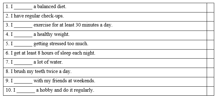 3. I do exercise for at least 30 minutes a day. (Tôi tập thể dục ít nhất 30 phút mỗi ngày.)