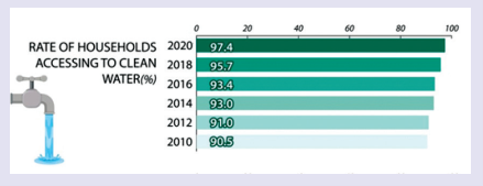 (Biểu đồ mô tả tỷ lệ hộ gia đình được sử dụng nước sạch từ năm 2010 đến năm 2020. Năm 2020, có 90,5 phần trăm hộ gia đình sử dụng nước sạch. Con số này đã đạt mức tăng ổn định đến đỉnh cao năm 2018 và đạt 95,7 %. Và quy chế gia đình sử dụng nước sách đã có cú nhảy vọt khi tăng đến 97,4% vào năm 2020.)