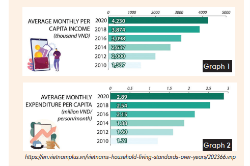 Thông tin: In 2010, the average monthly per capital income was 1.387 million VND, but this rose sharply to 4.230 million VND after ten years. Similarly, the second graph shows a steady increase in average monthly expenditure per capital per person.