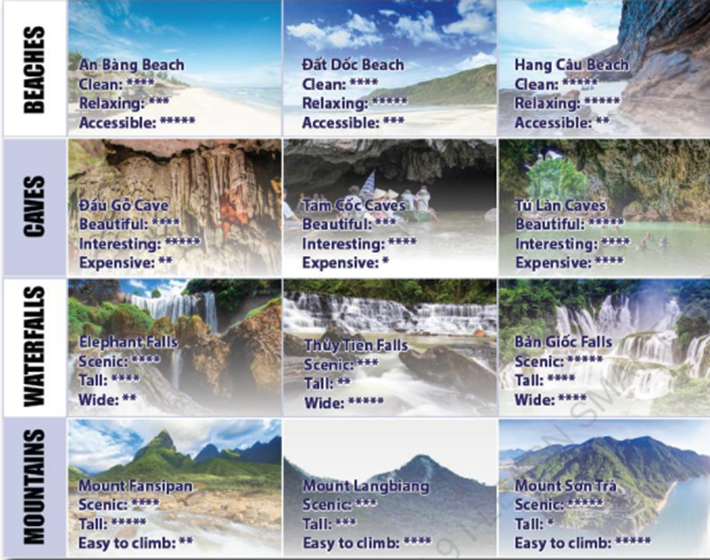 (Theo cặp. Lần lượt thảo luận về những kỳ quan thiên nhiên dưới đây và quyết định lựa chọn kỳ quan thiên nhiên phù hợp nhất cho mỗi danh mục.)