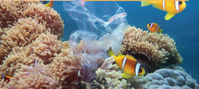(Bức tranh mô tả khung cảnh đại dương với những đàn cá đang bơi lội nhưng cũng có một chiếc túi nhựa nổi trên mặt nước. Sự hiện diện của túi nilon trong đại dương là một ví dụ rõ ràng về ô nhiễm biển, cụ thể là ô nhiễm nhựa. Ô nhiễm nhựa ở đại dương là một vấn đề nghiêm trọng do các hoạt động của con người gây ra như xử lý chất thải không đúng cách, xả rác và hệ thống quản lý chất thải không đầy đủ.)