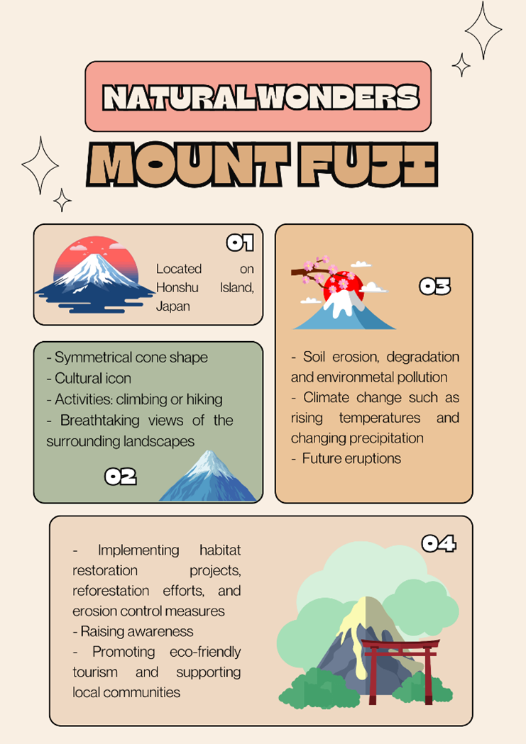 Work in groups. 1. Find a natural wonder. 2. Collect pictures of it. 3. Look for information about: 4. Make a poster about it. 5. Give a presentation about it to the class.